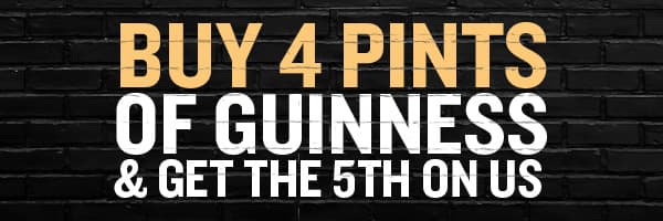 No food purchase required. The 5th pint of Guinness is redeemable on your next order once 4 pints have been ordered across one or more transactions. Drink responsibly. 18+. Terms & Conditions Apply.